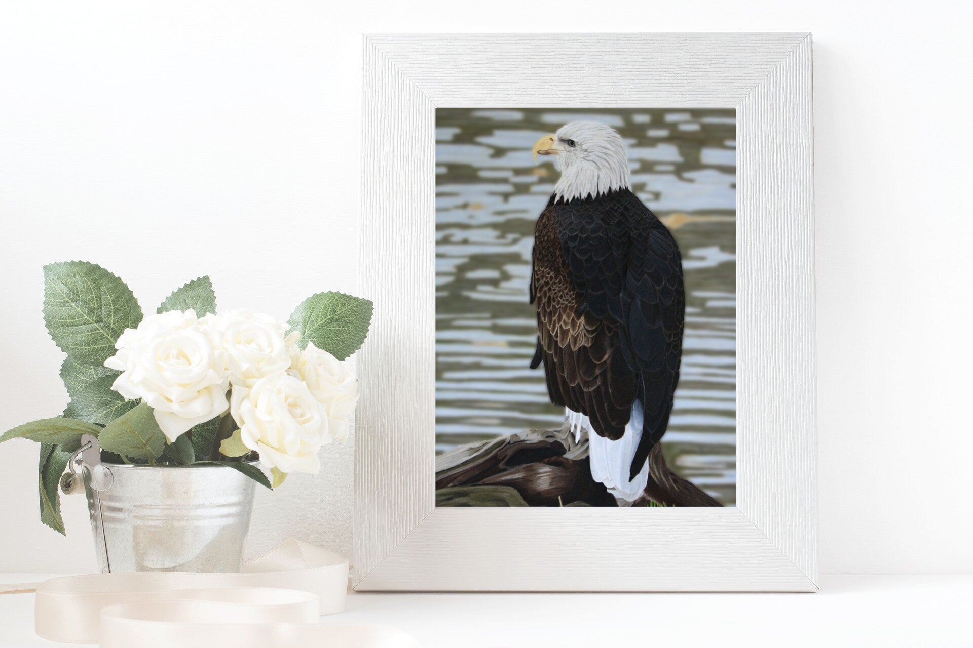This majestic eagle print is the perfect addition to your space. This artist print is printed on canvas paper for the look of a canvas print with the ease of paper, allowing for easy framing.