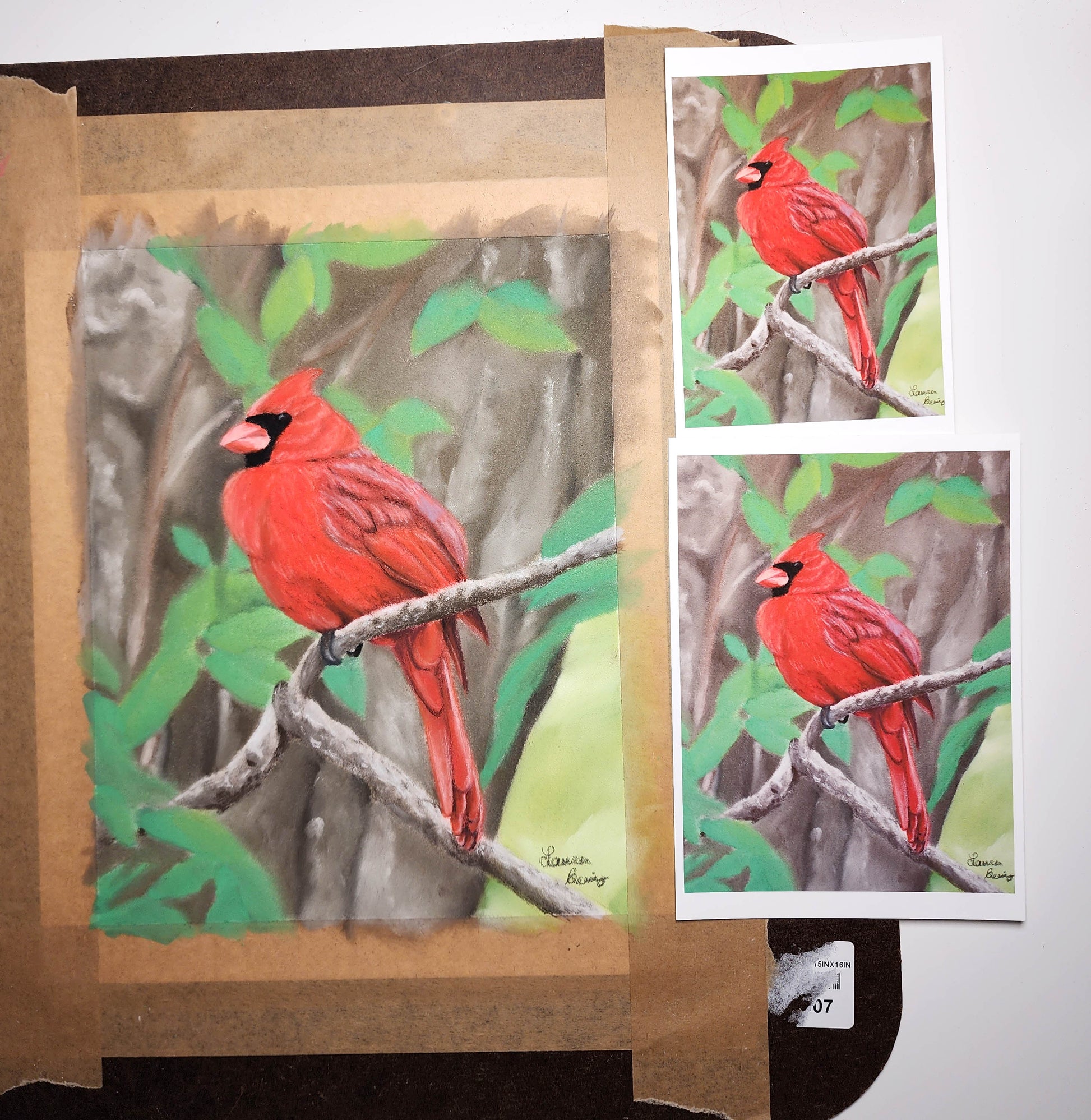 It is said that when you see a cardinal outside your window it is a loved one who has passed coming to visit you. I've always found cardinals to be so beautiful and they always bring me peace. These prints feature my original pastel cardinal which brings that same sense of peace.