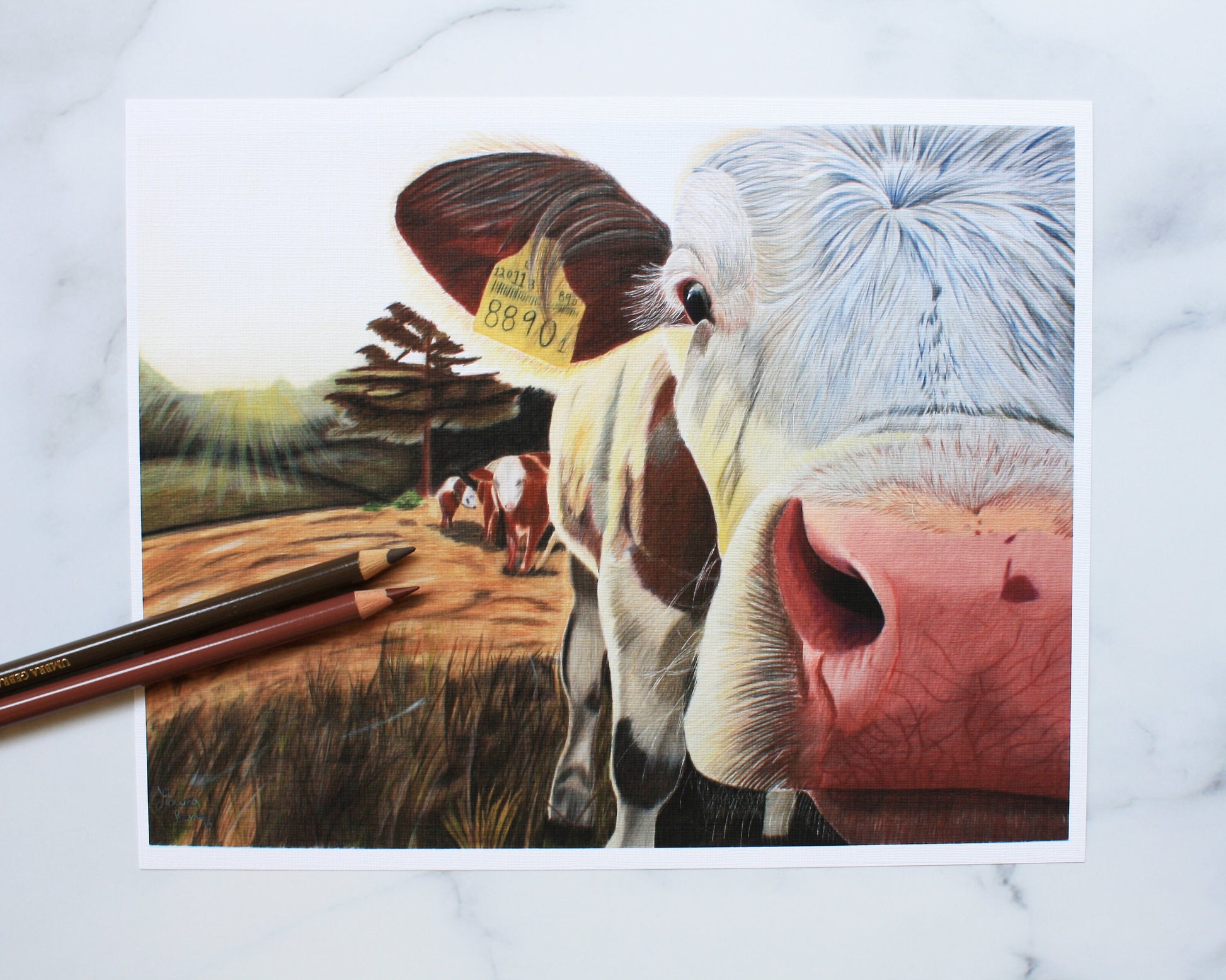 Prints are handmade and printed in my studio featuring my original colored pencil “Just Saying Hi” cow drawing.