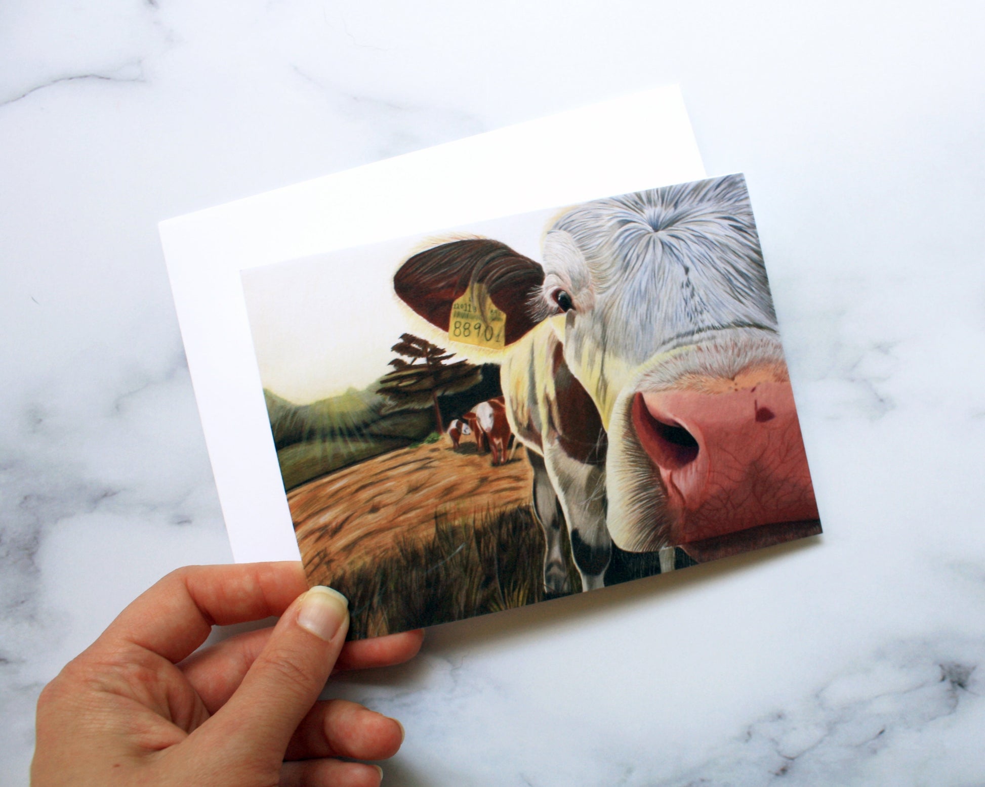 Want to tell someone you’re thinking of them? What better way than with this adorable cow greeting card. Like this cute cow coming over to say hi, check in with your family and friends by “Just Saying Hi” Handmade greeting card, printed and trimmed in my studio featuring my original colored pencil “Just Saying Hi” cow drawing.