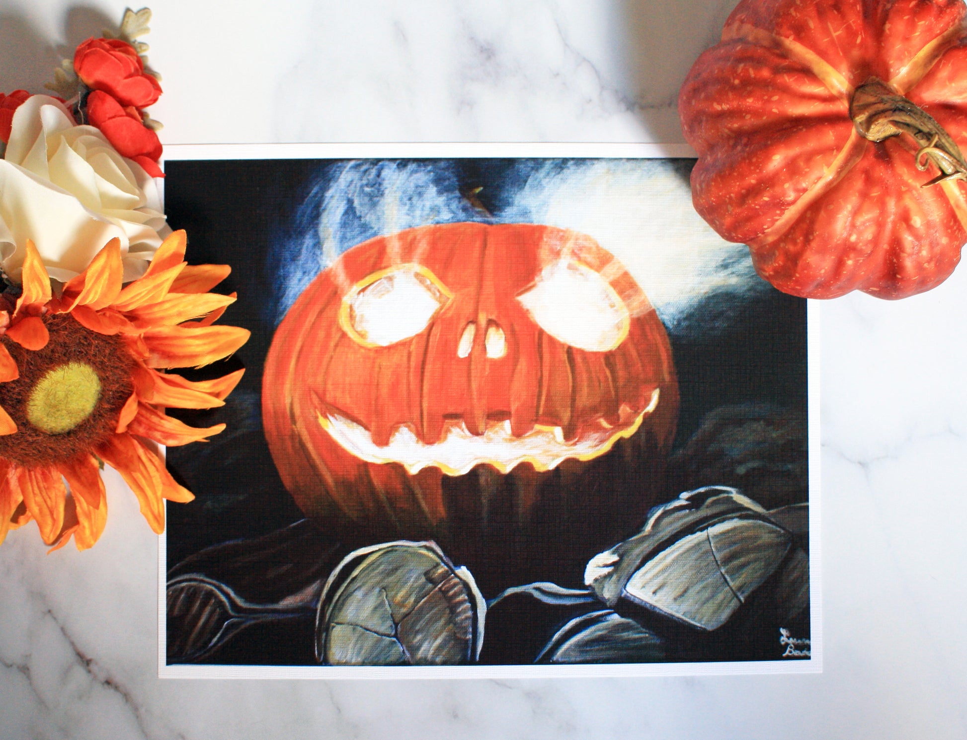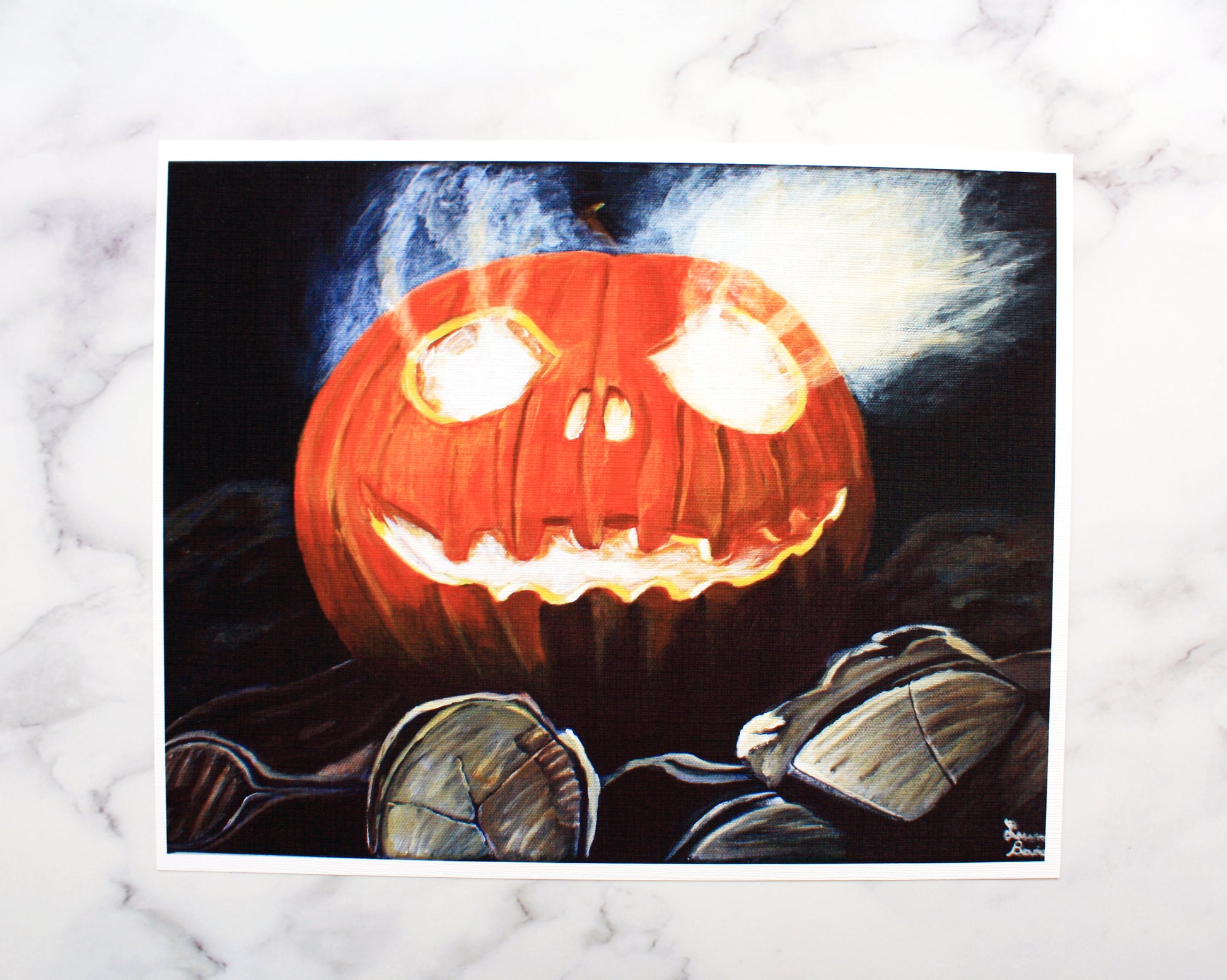 This spooky Jack O' Lantern artist print is the perfect addition to your autumn wall décor. This print is a great way to transform your space for Halloween.