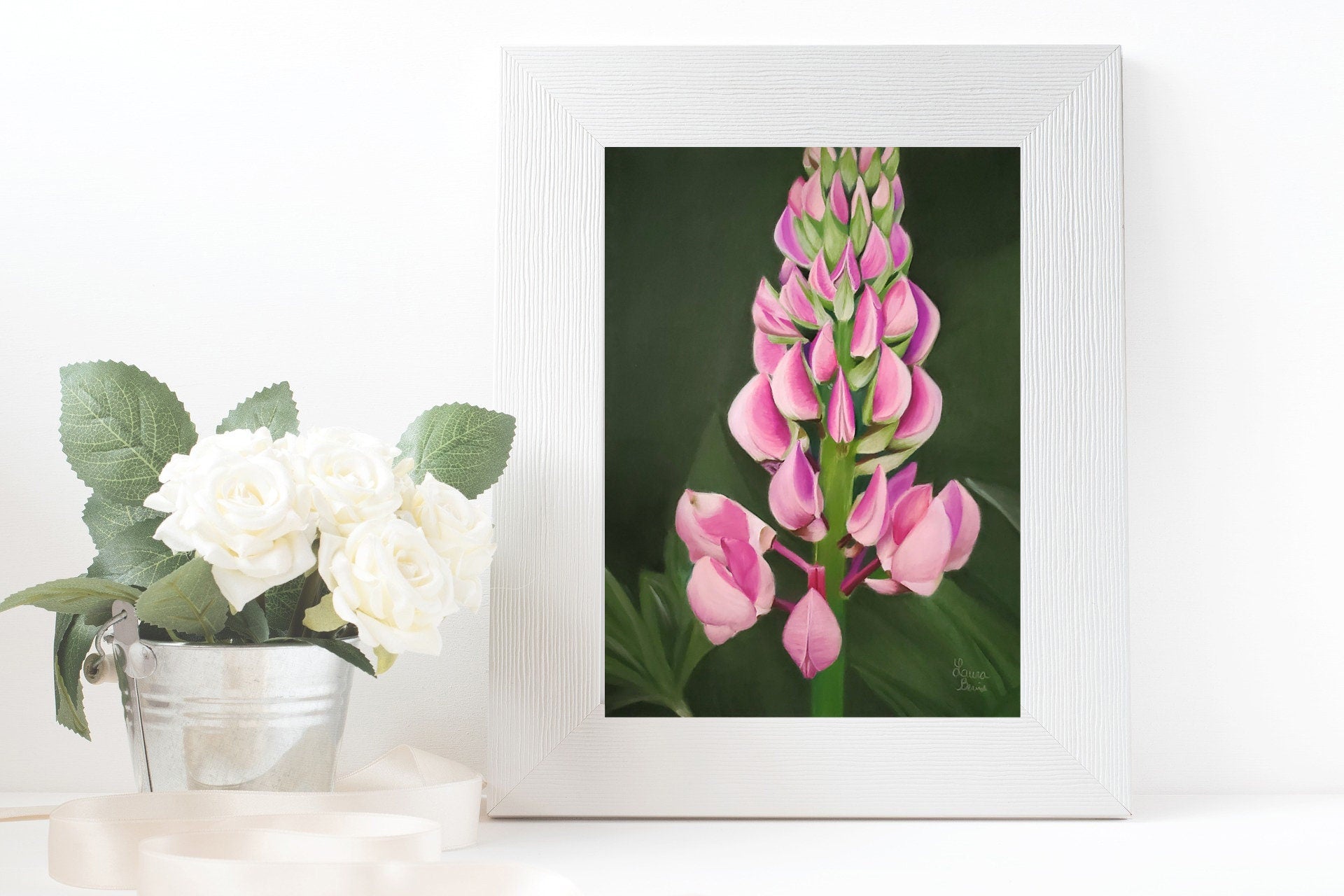 This stunning lupine print combines the ease of a paper print with the look of a canvas print. Prints are handmade and printed in my studio featuring my original colored pastel Lupine drawing.