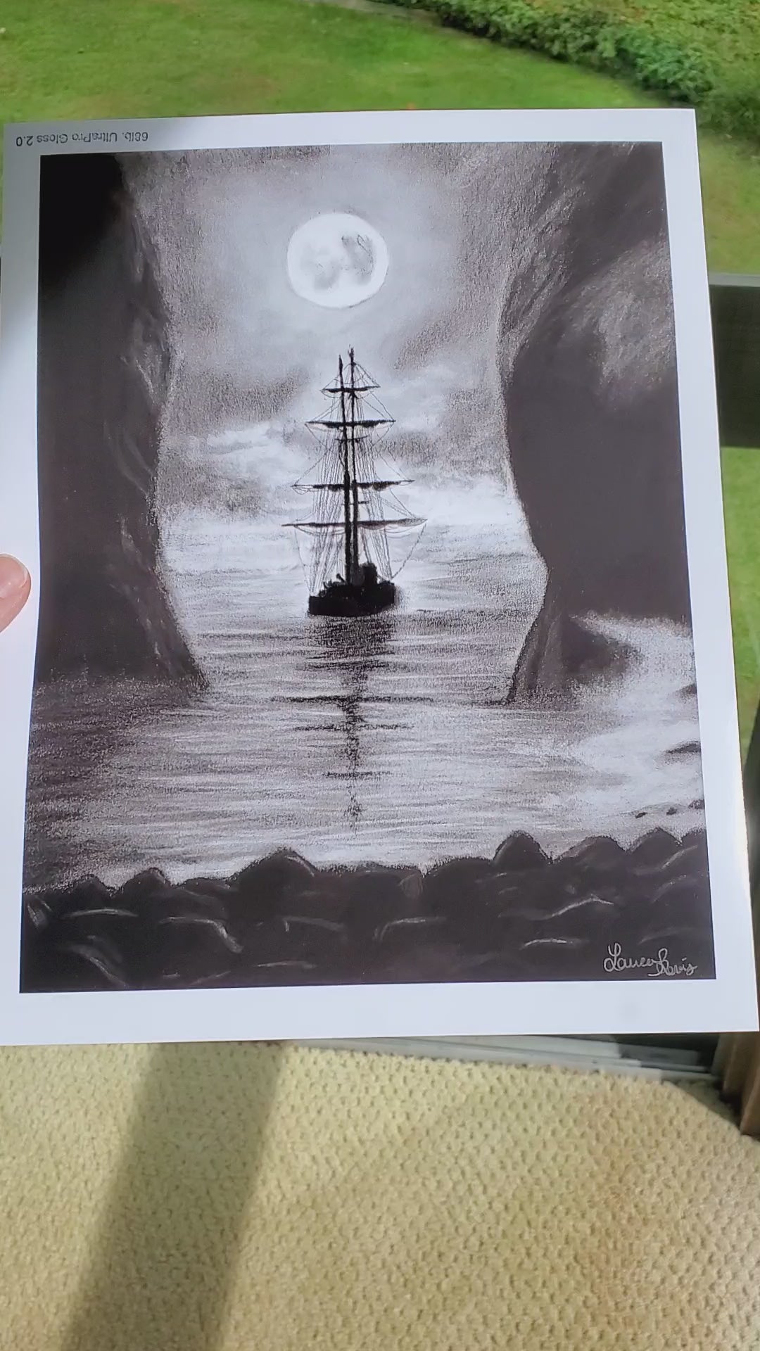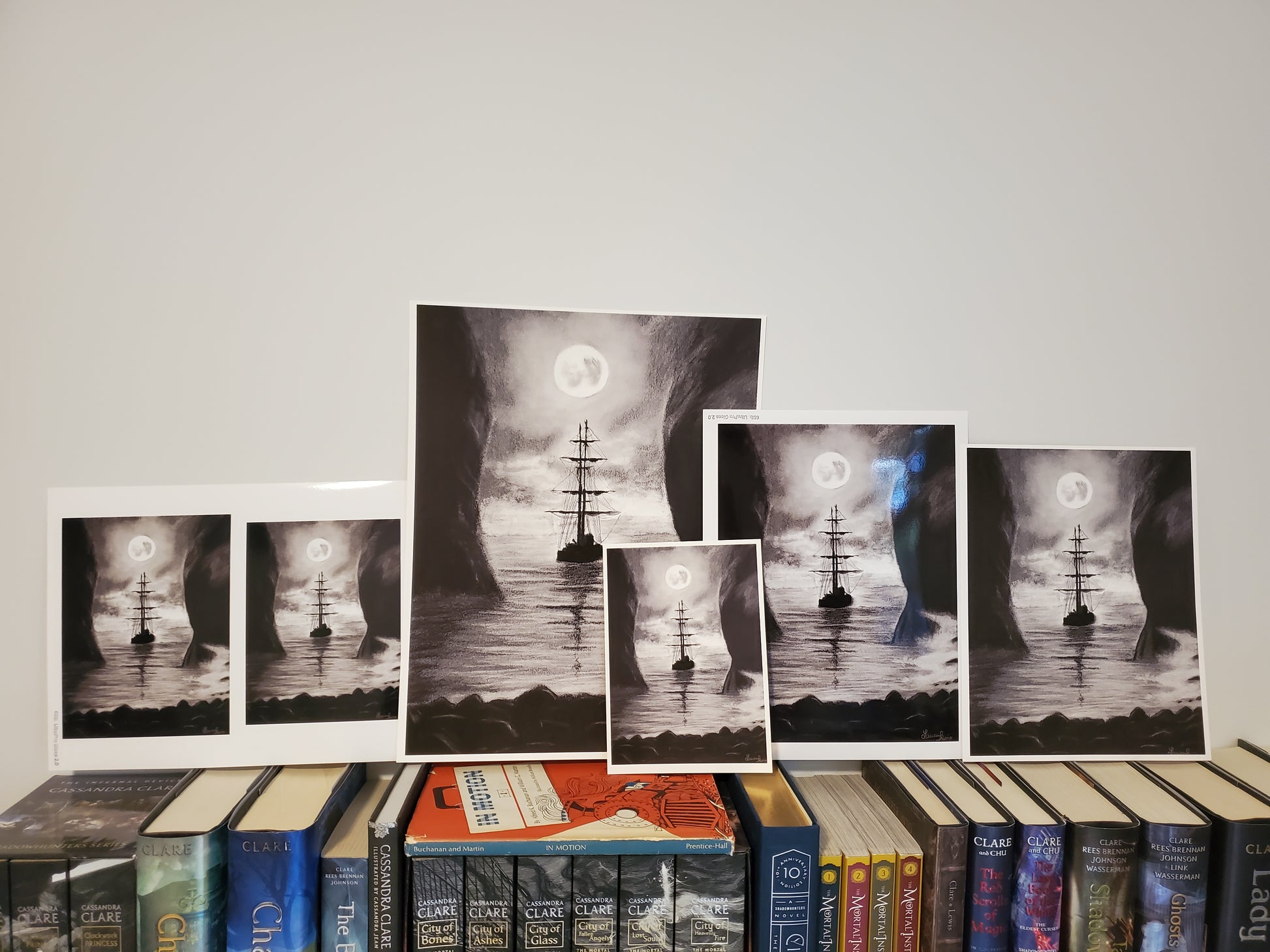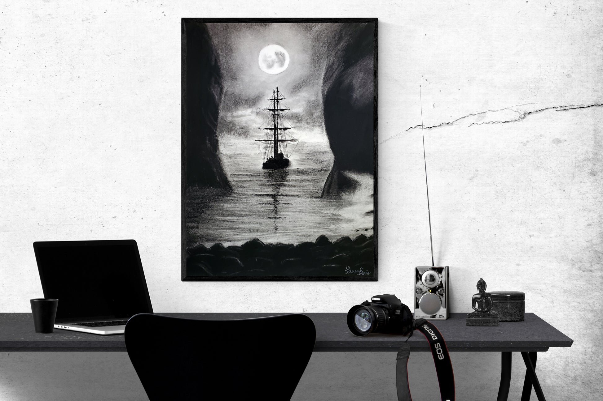 This glossy 8x10 print features my stunning pirate ship charcoal drawing. With the rising full moon casting a spooky glow, this print is the perfect addition to your Halloween decorations, or year-round home decor.