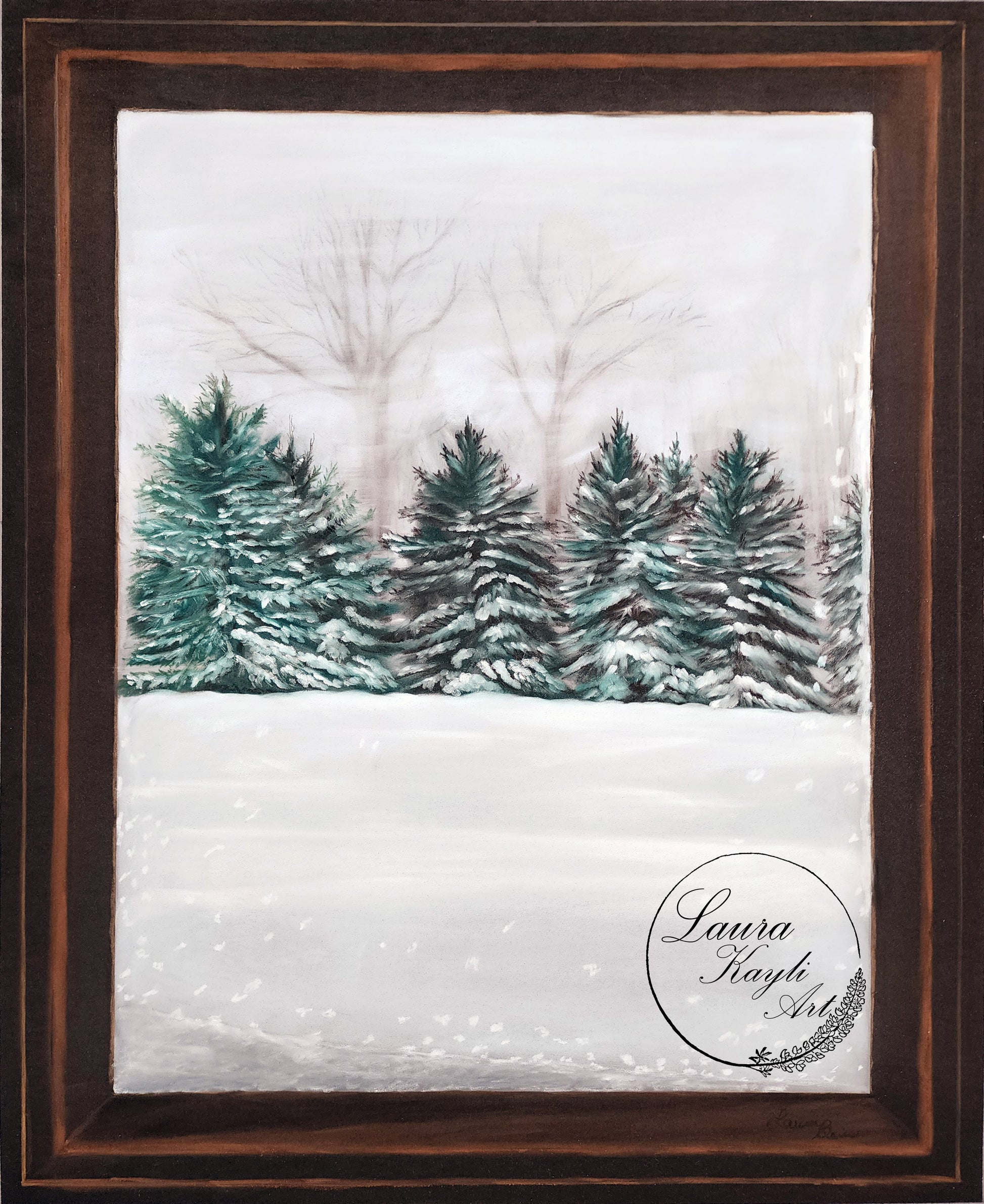 The perfect touch to your home for snowy days, these artist prints feature snow dusted trees. The 8x10 size of this print includes just the snowy scene, while the 11x14 looks out through a window.